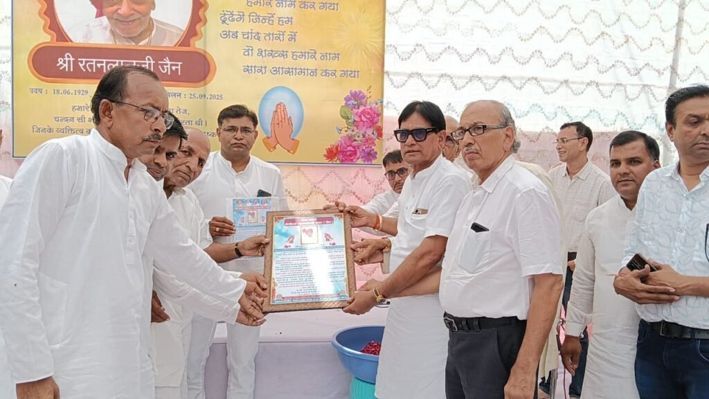 अभा श्री राजेंद्र जैन नवयुवक परिषद के राष्ट्रीय अध्यक्ष श्री प्रकाश छाजेड़ ने रानापुर नगर के वरिष्ठ श्री रतनलाल नाहर को उनकी प्रेरणा से परिवार के सदस्यों के द्वारा किए गए सेवा कार्यों, पर्यावरण की रक्षा के लिए किए गए कार्यों के हेतु मरणोपरांत सेवा सम्राट की उपाधि से अलंकृत किया गया । ये उपाधि श्री रतनलाल जैन के निधन पर आयोजित आत्म श्रेयार्थ जिनेंद्र भक्ति महोत्सव कार्यक्रम में परिषद के राष्ट्रीय अध्यक्ष प्रकाश छाजेड़ ने उनके परिजनों को सेवा सम्राट उपाधि पत्र भेंट कर दी । विदित हो कि जैन समाज के वरिष्ठ श्री रतनलाल जैन का 97 वर्ष की आयु में निधन हो गया । जिनके निधन पर परिवार के द्वारा नगर में 3 दिवसीय जिनेंद्र भक्ति महोत्सव का आयोजन किया । महोत्सव में परमात्मा की पूजन और भक्ति आयोजित की गई जिसमें पार्श्व संगीत मंडल के पवन नाहर,जितेंद्र जैन,कमलेश कटारिया ने सुंदर भक्ति गीतो की प्रस्तुति दी । साथ ही उनके निवास पर एक श्रंद्धाजलि सभा आयोजित की गई जिसमें श्री मुनिसुव्रत स्वामी जिनालय के अध्यक्ष चंद्रसेन कटारिया, श्री श्वेतांबर जैन श्री संघ के अध्यक्ष दिलीप सकलेचा, अग्रवाल समाज के संजय अग्रवाल,संदेश सेठिया, झाबुआ जैन समाज के तेजप्रकाश कोठारी, देपालपुर के सुदर्शन जैन, इंदौर के राजेंद्र चोरड़िया आदि ने अपने शब्दों से श्री जैन के जीवन बारे में विस्तार से बताते हुए उन्हें श्रंद्धाजलि अर्पित की । कार्यक्रम का संचालन जितेंद्र सालेचा ने किया । इस प्रसंग पर श्री रतनलाल जैन परिवार की और से विभिन्न जिन मंदिर और गौशाला में राशि भेंट की गई ।
