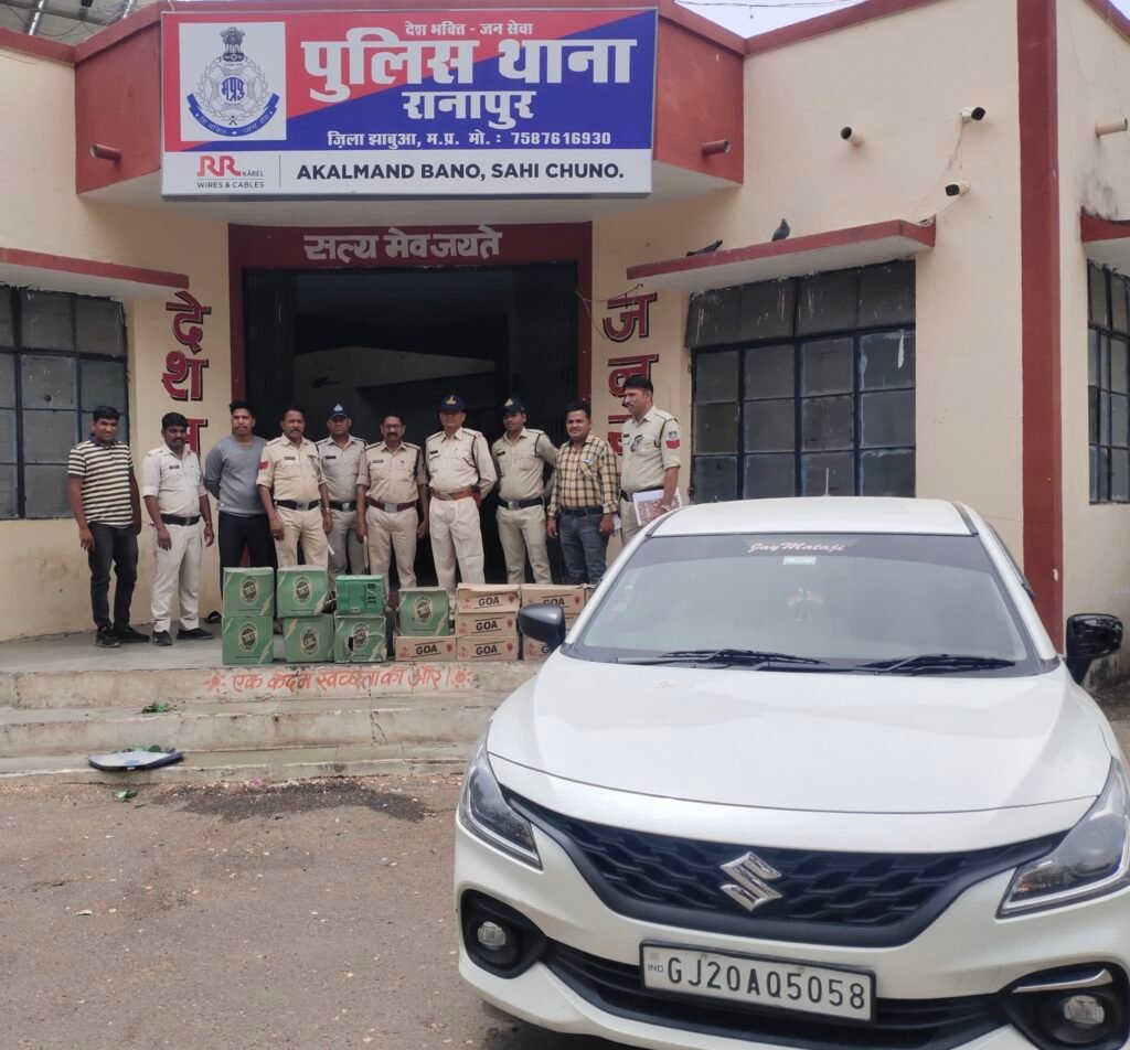 दिनांक 03.04.2024 को थाना राणापुर एवं चौकी मोरडुंडीया की पुलिस को बडी मात्रा में अवैध शराब के परिवहन की विश्वसनीय मुखबीर सुचना प्राप्त हुई थी जिसपर पुलिस टीम द्वारा तत्परता दिखाते हुवे ग्राम अंधारवाड चोरमाण्डली तिराहा आम रोड पर घेरा बंदी कर एक बलेनो कार जिसका क्रमांक GJ-20-AQ-5058 को पकडा, पुलिस की घेराबंदी देख बलेनो कार में बैठे तीनो आरोपी अंधेरे का फायदा उठा कर वहाँ से भाग गये , बलेनो कार में 10 बोल्ट कम्पनी की पेटीयां एवं 10 गोवा व्हिस्की कम्पनी की पटिया जिसमें करीबन कुल 164.400 बल्क लीटर किमती 68400 रुपये की जप्ति की गई एवं बलेनो कार की किमत 5 लाख रुपये की जप्त कर आरोपीयो के विरुध्द अप.क्रं. 228/2024 धारा 34(2)36,46 आबकारी एक्ट का पंजीबध्द कर विवेचना में लिया गया ।