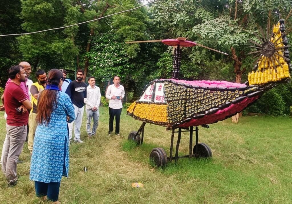 पानी की प्लास्टिक बोतल से हैलिकप्टर की आकृति निर्माण लगभग 500 नग (10 किलो ग्राम) वेस्ट प्लास्टिक की बोतल का उपयोग किया गया एवं टायर पुराने 04 नग (20 किलो ग्राम) का उपयोग किया गया ।