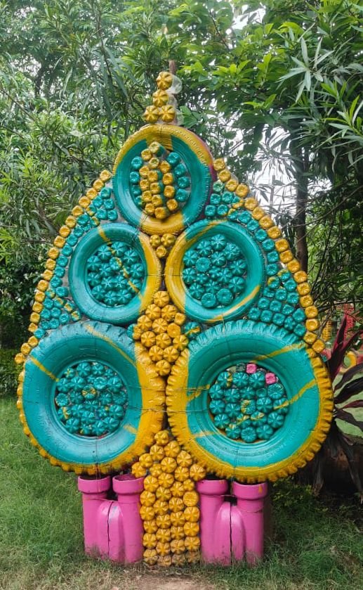 टायरो से फुल का निर्माण टायर 06 नग, वेस्ट पाईप 04 नग ,पानी की प्लास्टिक बोतल 360 पुरानी बोतलो का (6 किलो ग्राम) का उपयोग किया गया । दीवार सजावट दिवाल घडी में एक टायर,सौफा सेट टायर से 09 टायर 90 पानी की प्लास्टिक बातलो से फुल बनाकर लगाये । पौधे हेतु गमले पुरानी पेन्ट से 04 गमले तैयार किया गया ।