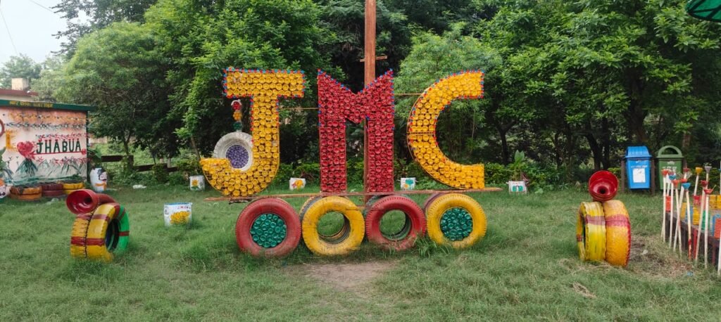 पानी की प्लास्टिक बोतल से कार की आकृति निर्माण लगभग 700 नग (14 किलो ग्राम) वेस्ट प्लास्टिक की बोतल का उपयोग किया गया एवं टायर पुराने 03 नग (15 किलो ग्राम) का उपयोग किया गया । पानी की प्लास्टिक बोतल से जे.एम.सी. (झाबुआ नगर पालिका लोगो) का निर्माण लगभग 2000 नग (42 किलो ग्राम) वेस्ट प्लास्टिक की बोतला का उपयोग किया गया एवं टायर पुराने 12 नग (108 किलो ग्राम) का उपयोग किया गया । पानी की प्लास्टिक बोतल से पान के पत्ते की आकृति निर्माण लगभग 800 नग (15 किलो ग्राम) वेस्ट प्लास्टिक की बोतल का उपयोग किया गया एवं टायर पुराने 05 नग (75 किलो ग्राम) का उपयोग किया गया । पानी की प्लास्टिक बोतल से यातायात सिंगल पाईन्ट लगभग 70 नग (1.5 किलो ग्राम) वेस्ट प्लास्टिक की बोतल का उपयोग किया गया एवं टायर पुराने 01 नग (12 किलो ग्राम) का उपयोग किया गया । पानी की प्लास्टिक बोतल से दिवार का निर्माण लगभग 320 (7 किलो ग्राम) वेस्ट प्लास्टिक की बोतला का उपयोग किया गया एवं टायर पुराने 02 नग (18 किलो ग्राम) का उपयोग किया गया । पानी की प्लास्टिक बोतल से पौधे हेतु क्यारीया लगभग 400 नग (4.5 किलो ग्राम) वेस्ट प्लास्टिक की बोतला का उपयोग किया गया । पानी की प्लास्टिक बोतल से झोपडी का निर्माण लगभग 1800 नग (21 किलो ग्राम) वेस्ट प्लास्टिक की बोतला का उपयोग किया गया । झोपडी बैठक व्यवस्था हेतु वेस्ट पाईप से बैंच वेस्ट पाईप 09 फिट (54 किलो ग्राम) वेस्ट पाईप का उपयोग किया गया । टायर में जुते लगा कर गमले तैयार किये गये बोतल 60 (1 किलो ग्राम) वेस्ट प्लास्टिक की बोतला का उपयोग किया गया एवं टायर पुराने 01 नग (25 किलो ग्राम) एवं 08 पुराने जुतो का उपयोग कर गमले बनाये गये ।