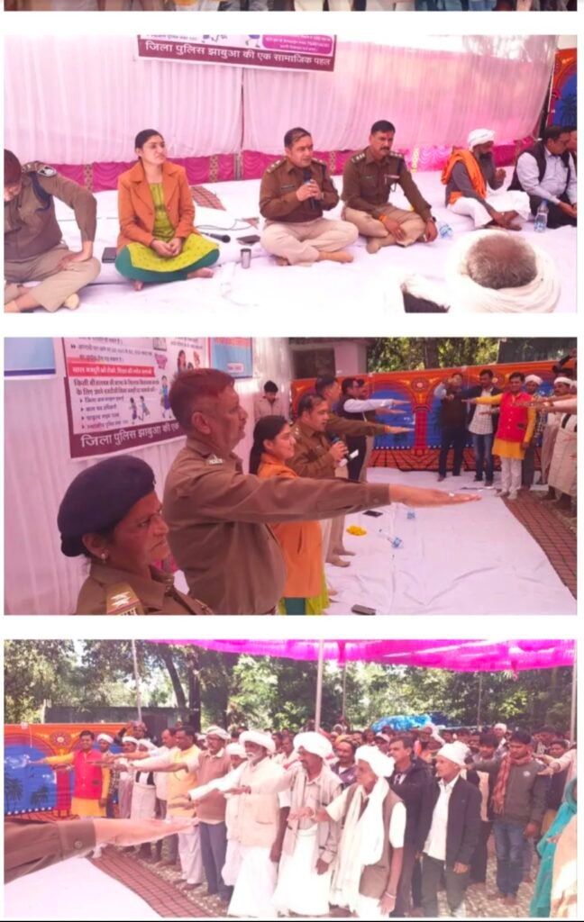 कार्यक्रम में साइबर क्राइम के बारे में लोगो को जागरूक करते हुए उन्होंने ओटीपी धोखाधडी, डिजिटल अरेस्ट, आदि के बारे में लोगो को जागरूक किया। आधार कार्ड के प्रयोग के बारे में उन्होंने बताया की यदि हम किसी कार्य जैसे सिम लेने, होटल आदि में अपना आधार प्रयोग करते है तो आधार कार्ड को प्रति पर उस कार्य का उल्लेख करके ही संबंधित को अपने आधार कार्ड की छाया प्रति देवे। कार्यक्रम में पुलिस अधीक्षक महोदय द्वारा उपस्थित ग्रामीणों को अपने बच्चो को कम से कम 12वी तक पढ़ाने, बाल विवाह न करने, नशा न करने, भांजगढ़ी न करने, डीजे का उपयोग बंद करने के की शपथ दिलाई। कार्यक्रम के अंत में एसडीओपी झाबुआ श्रीमती रूपरेखा यादव ने उपस्थित ग्रामीणों व गणमान्य नागरिकों का आभार व्यक्त किया। कार्यक्रम में एसडीओपी झाबुआ श्रीमती रूपरेखा यादव, उप पुलिस अधीक्षक श्री कमलेश शर्मा, उप पुलिस अधीक्षक श्री गिरीश कुमार जेजुरकर, रक्षित निरीक्षक झाबुआ, थाना रानापुर प्रभारी निरी. श्री दिनेश रावत, थाना कोतवाली प्रभारी निरी. श्री आर सी भस्करे, ट्रैफिक थाना प्रभारी निरी. श्री राजू सिंह बघेल, रक्षा सखी प्रभारी उप निरी. श्रीमती अनिता तोमर, साइबर टीम एवं अन्य अधिकारी कर्मचारी उपस्थित रहे।